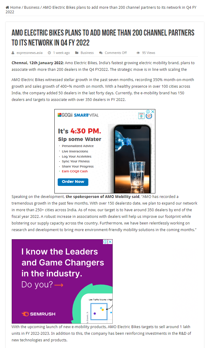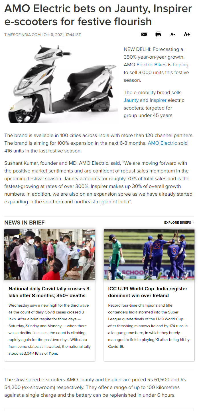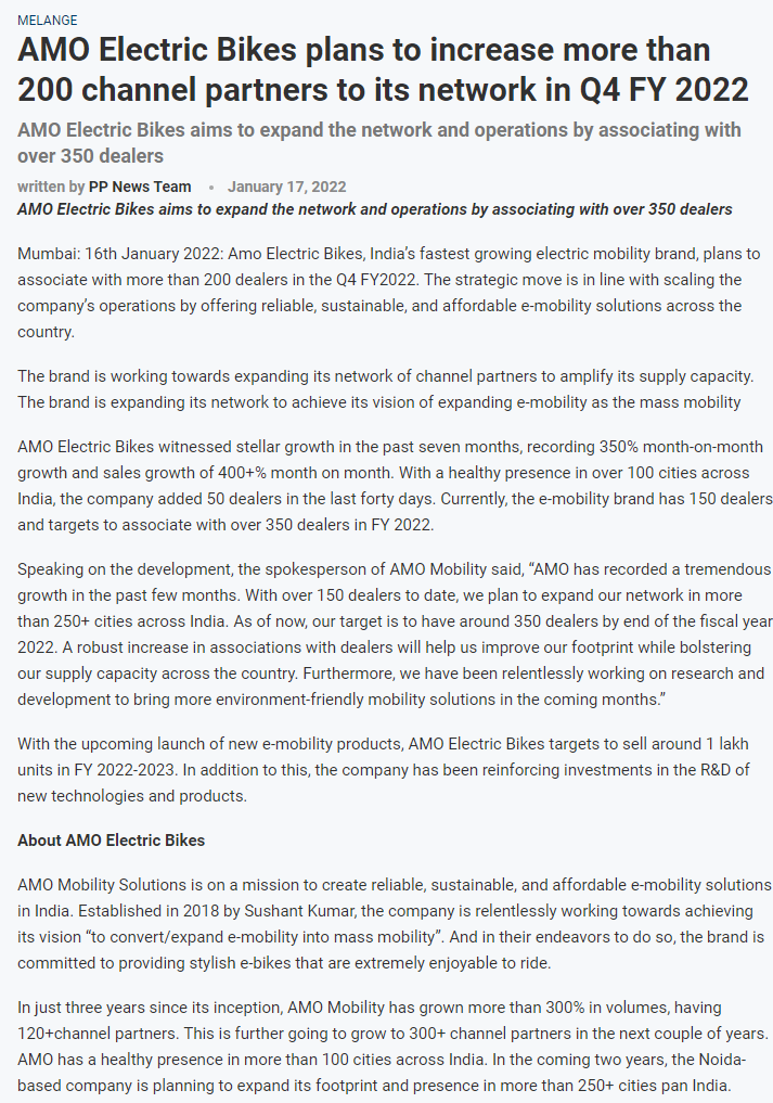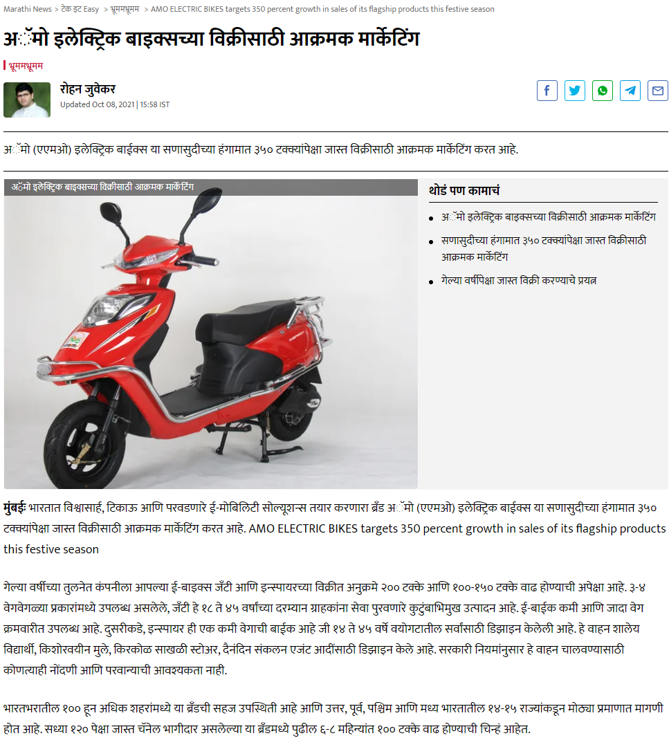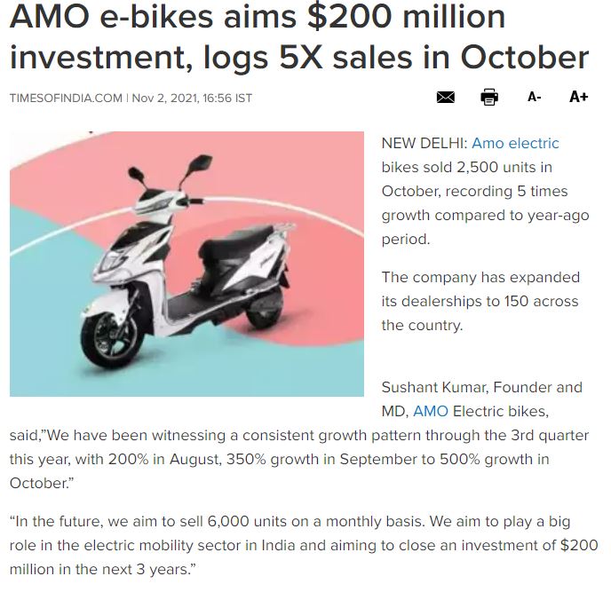 Amo electric bikes targets 350 percent growth in sales of its flagship products-2021
