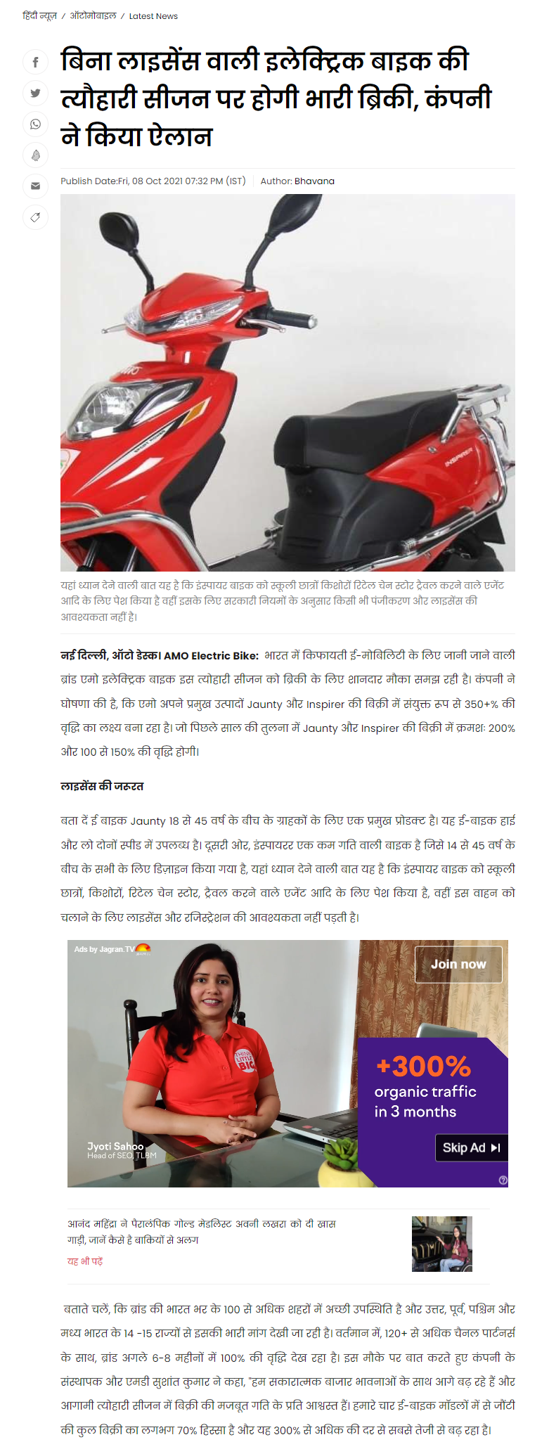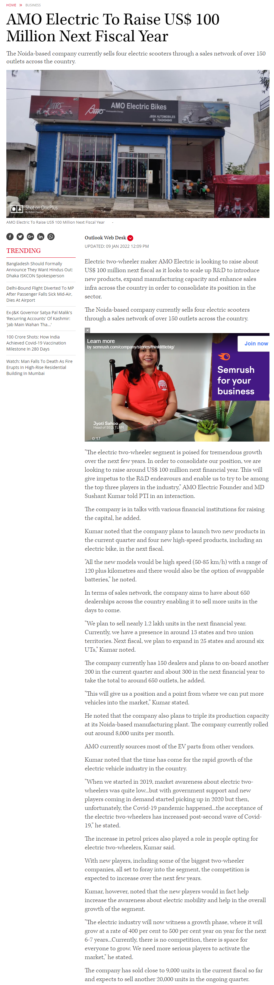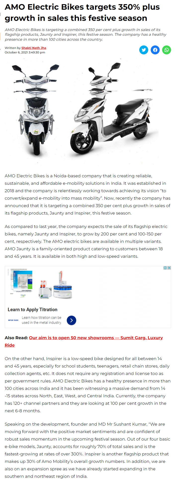Amo electric bikes targets 350 percent growth in sales of its flagship products-2021
