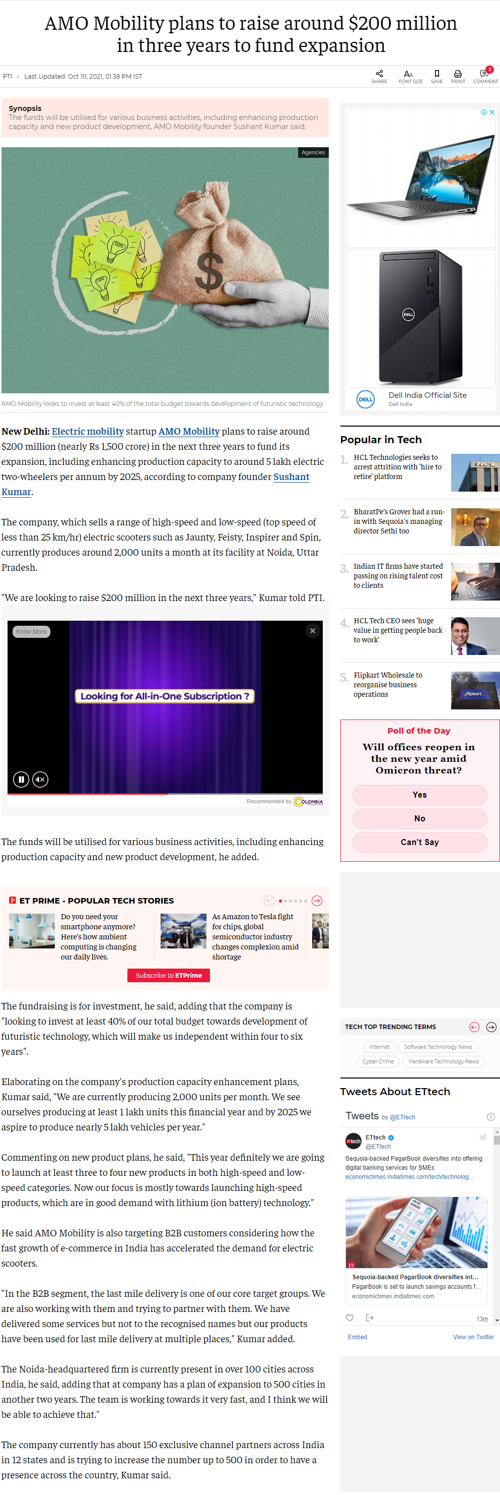 AMO Mobility plans to raise around Rs 1,500 crore in 3 yrs to fund expansion