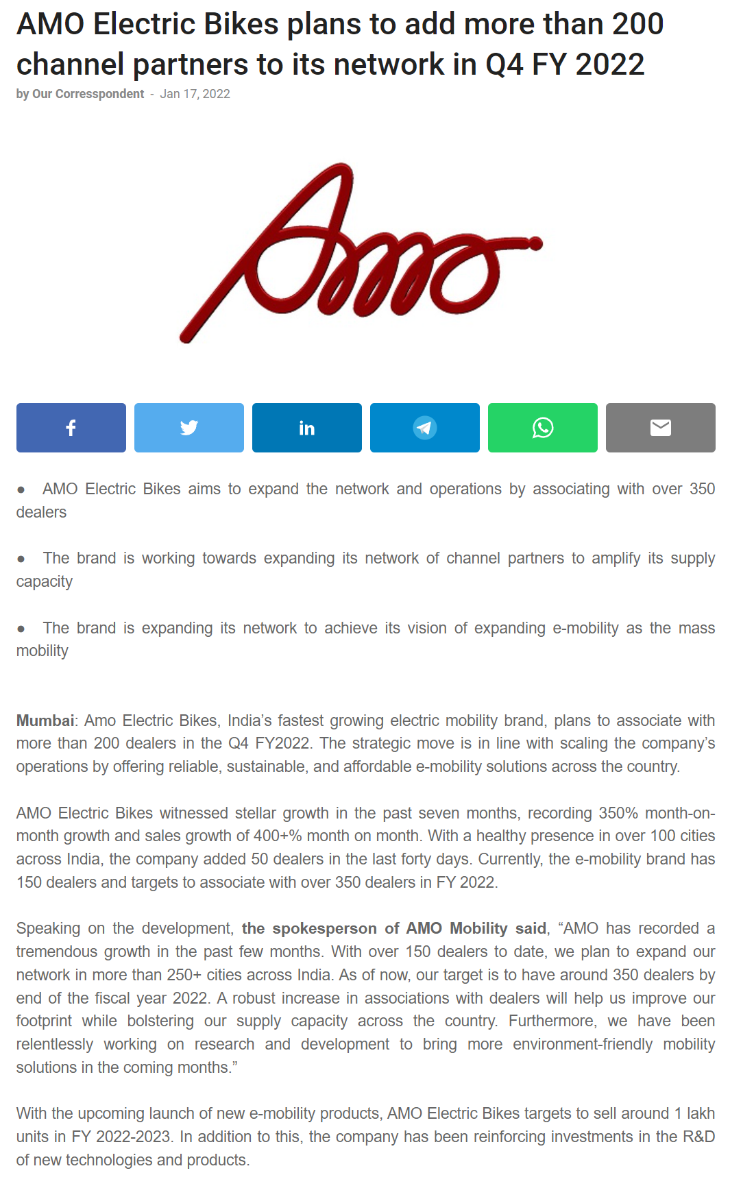 AMO E-Bikes plans to increase more than 200 channel partners